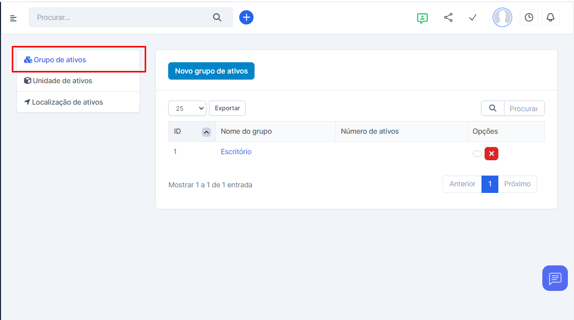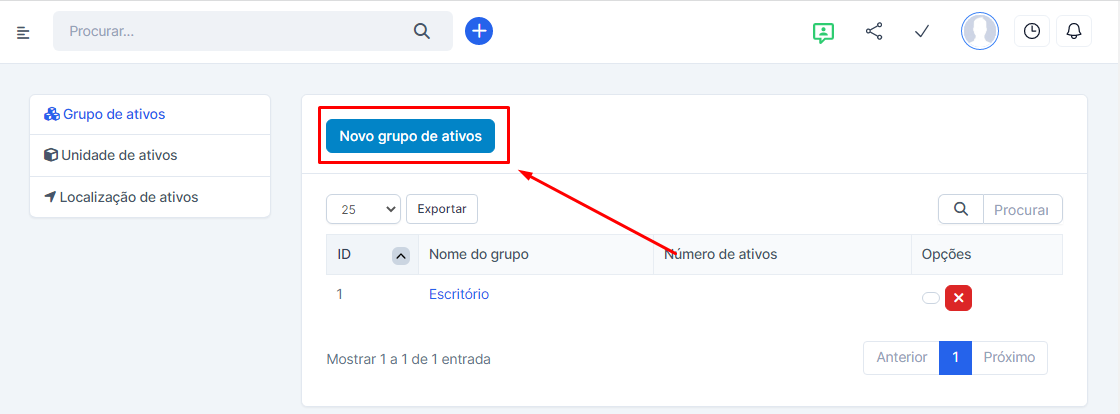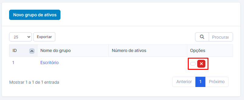 Para adicionar e editar os grupos de ativos, acesse a página de Configuração da seção de Ativos.