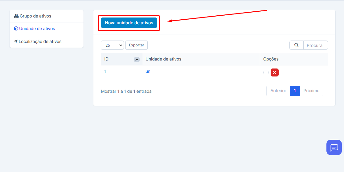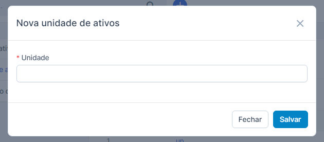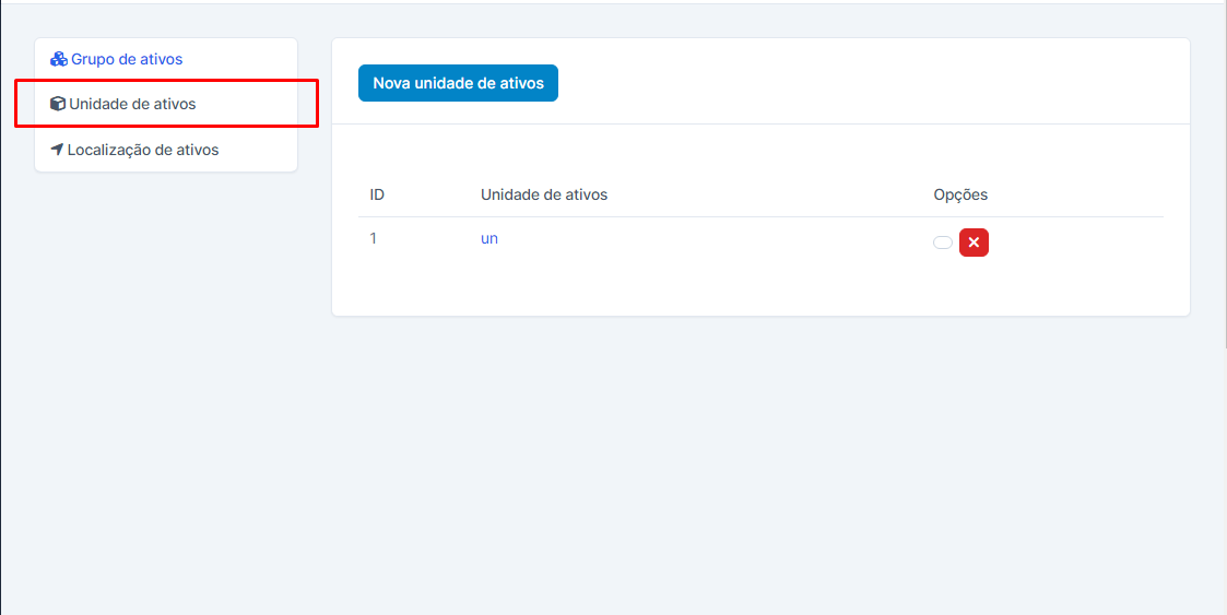 Clique em “Nova unidade de ativos” para criar uma nova unidade de medida (ex. unidade - un).