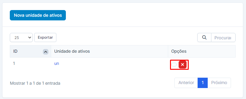 Caso queira editar ou excluir uma unidade de ativos. Use as ferramentas de edição.