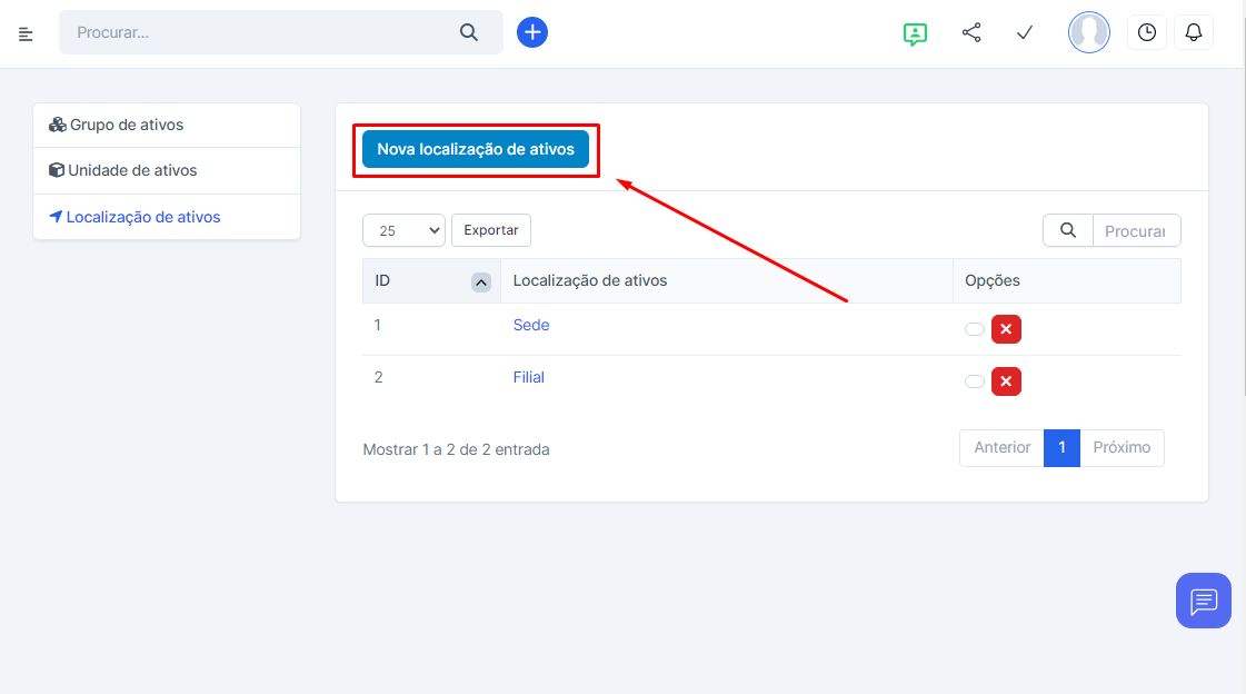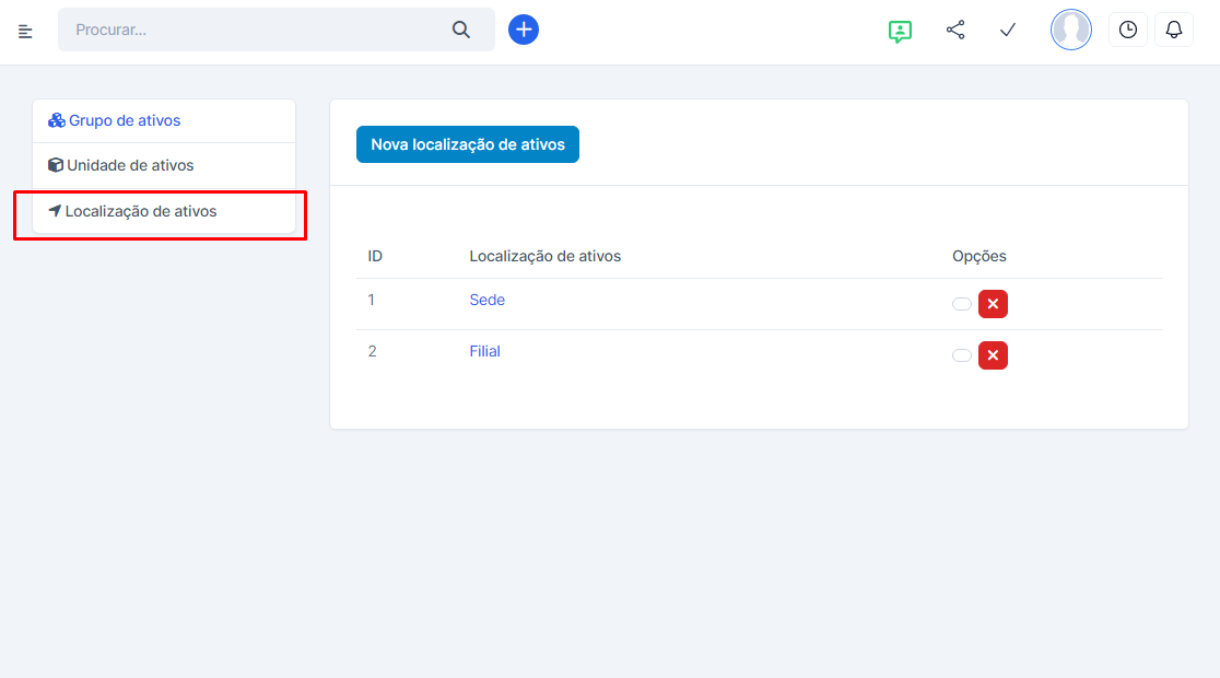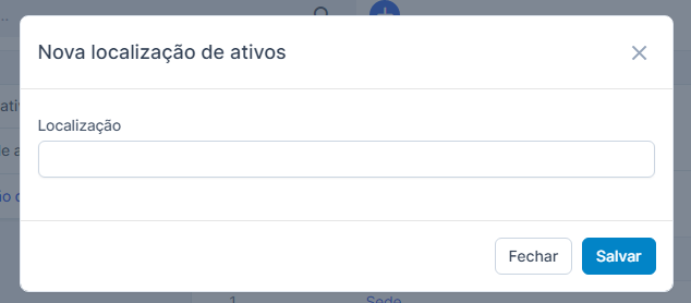 Clique em “Nova localização de ativos” para criar uma nova localização (ex. sede, filial).