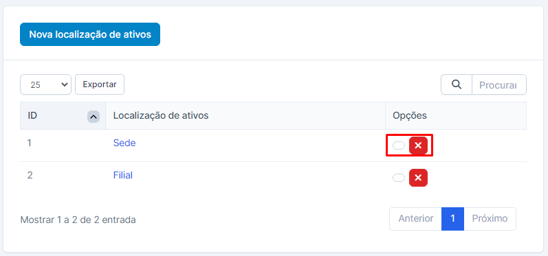 Caso queira editar ou excluir uma localização de ativos. Use as ferramentas de edição.