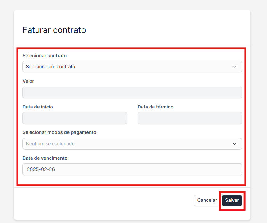 Pronto! Assim que você preencher as informações, a fatura será vinculada automaticamente ao contrato selecionado.