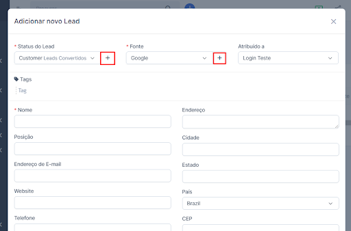 Preencha os dados de status, fonte e o responsável por esses leads para completar o cadastro.