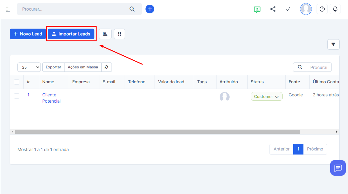 Clique no botão “Importação de Leads” na tela inicial da seção.