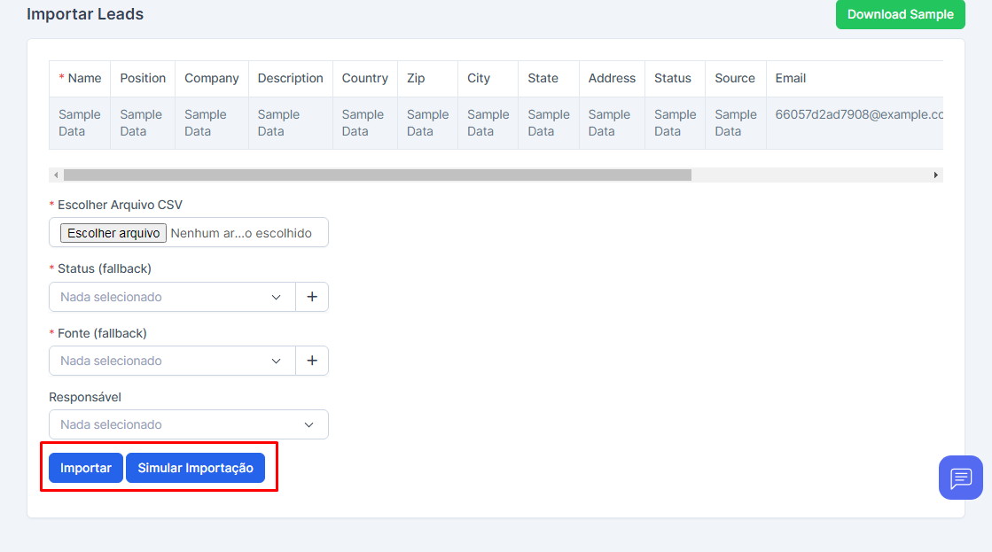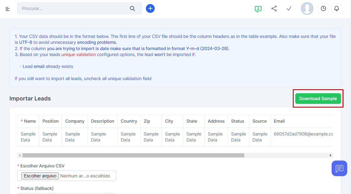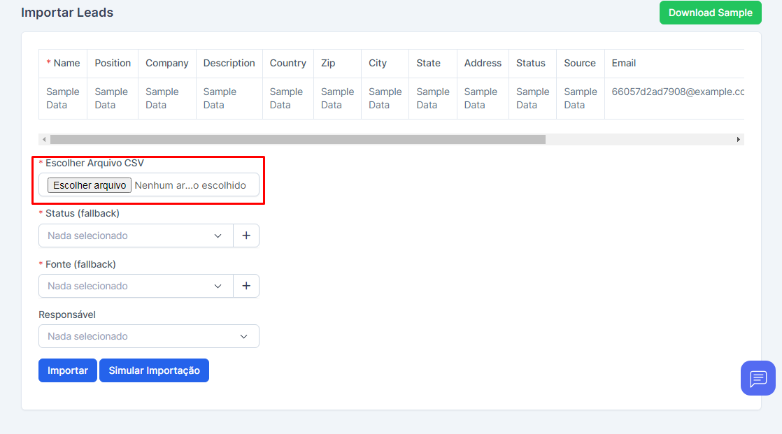 Na tela de importação, você pode baixar um arquivo de exemplo para visualizar os campos de importação do arquivo em “Download Sample”.