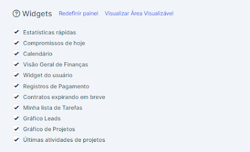 Através dele, você tem acesso aos botões de seleção dos widgets do Painel. Como predefinição, todos os campos vêm habilitados, caso queira desabilitar apenas clique na caixa de seleção.