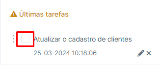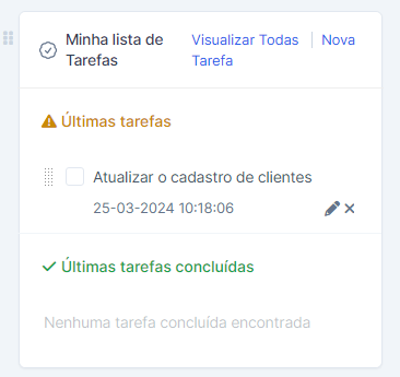 Caso tenha que editar uma tarefa, clique no ícone , ou se deseja excluir, clique no botão de X. O acompanhamento do progresso pode ser feito pelo Painel, caso deseje marcar uma tarefa como concluída, marque a caixa de seleção ao lado da tarefa.
