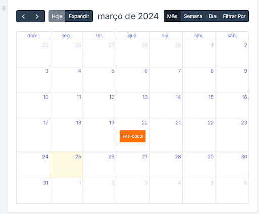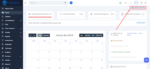 O painel contém um widget de calendário onde é possível fazer o agendamento e acompanhamento de faturas, compromissos, prazos.