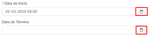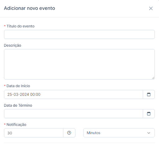 Na tela de criação de evento, é necessário preencher os campos marcados com *. No campo da data, é possível informar a data ou visualizar o calendário clicando no botão no lado direito.