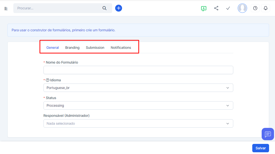 Você abrirá o construtor de formulário, nele há 4(quatro) abas de configuração, é necessário preencher todos os campos indicados em *.
