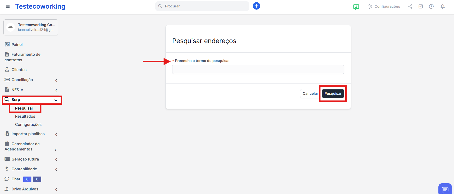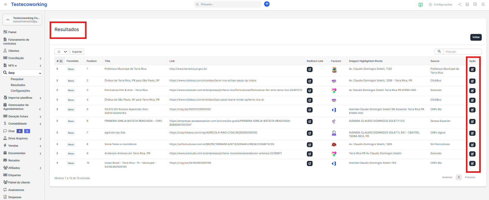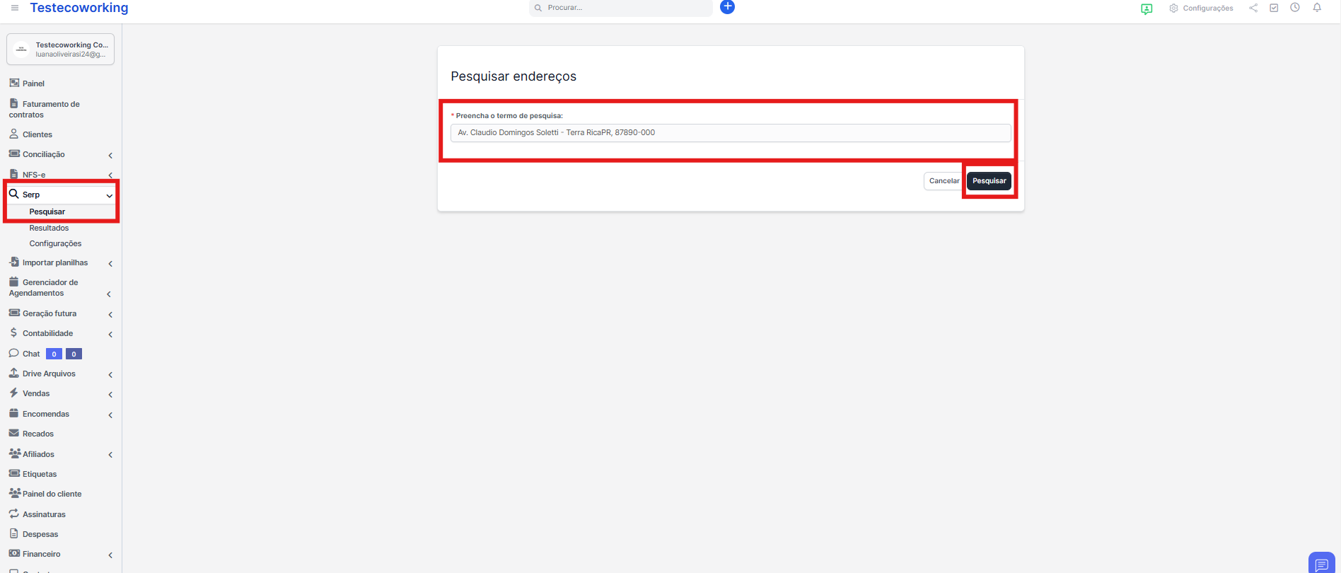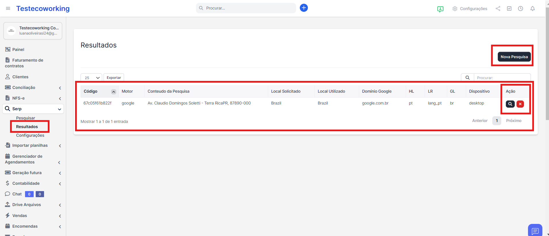 Na seção "Serp", você realiza uma pesquisa com o seu endereço de uso comercial, para identificar onde o mesmo está sendo utilizado.