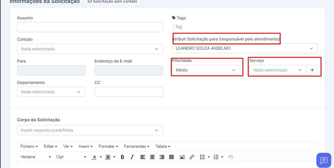 Preencha os detalhes da solicitação como assunto, departamento, responsável pela atribuição, prioridade, seção e detalhe seu pedido.