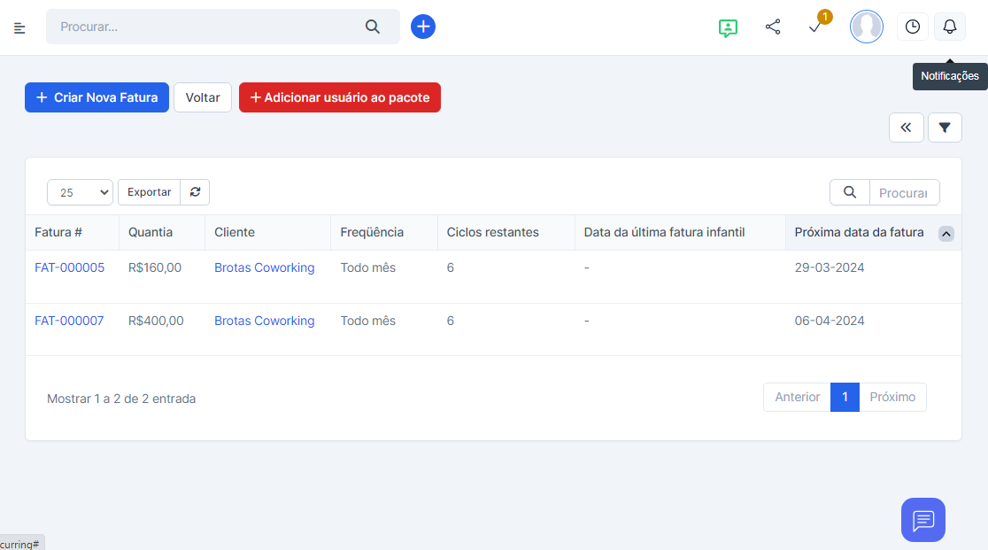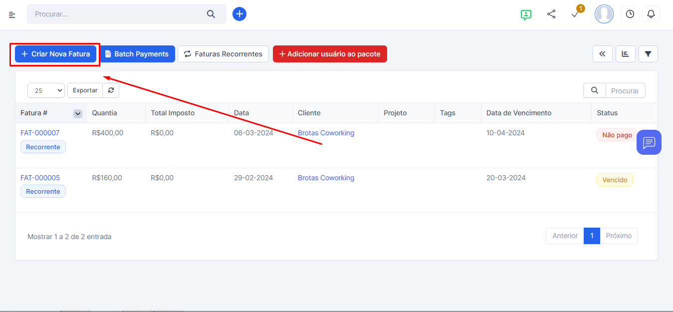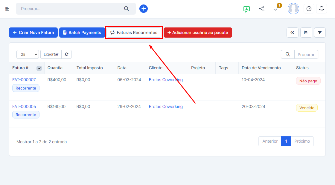 Você será redirecionado para a página de assinaturas recorrentes onde você pode visualizar todas as faturas recorrentes e criar novas faturas recorrentes em “Criar Fatura Recorrente”.