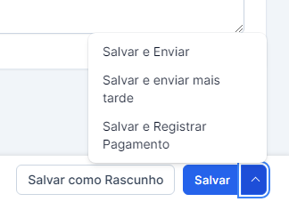 Envie a fatura para o cliente para pagamento.Na hora do salvamento há como salvar a fatura como rascunho ou salvar normalmente, há também como escolher o modo de envio pro cliente nas seguintes opções:
