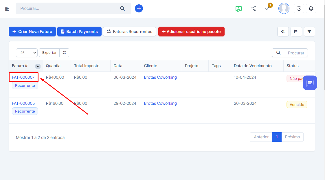 Na tela inicial, identifique a fatura ou cliente através da busca. Identificada a fatura, clique em cima do nome da fatura para ver mais detalhes.