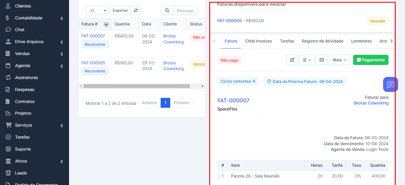 Selecione "Faturas Recorrentes" para visualizar mais detalhes.