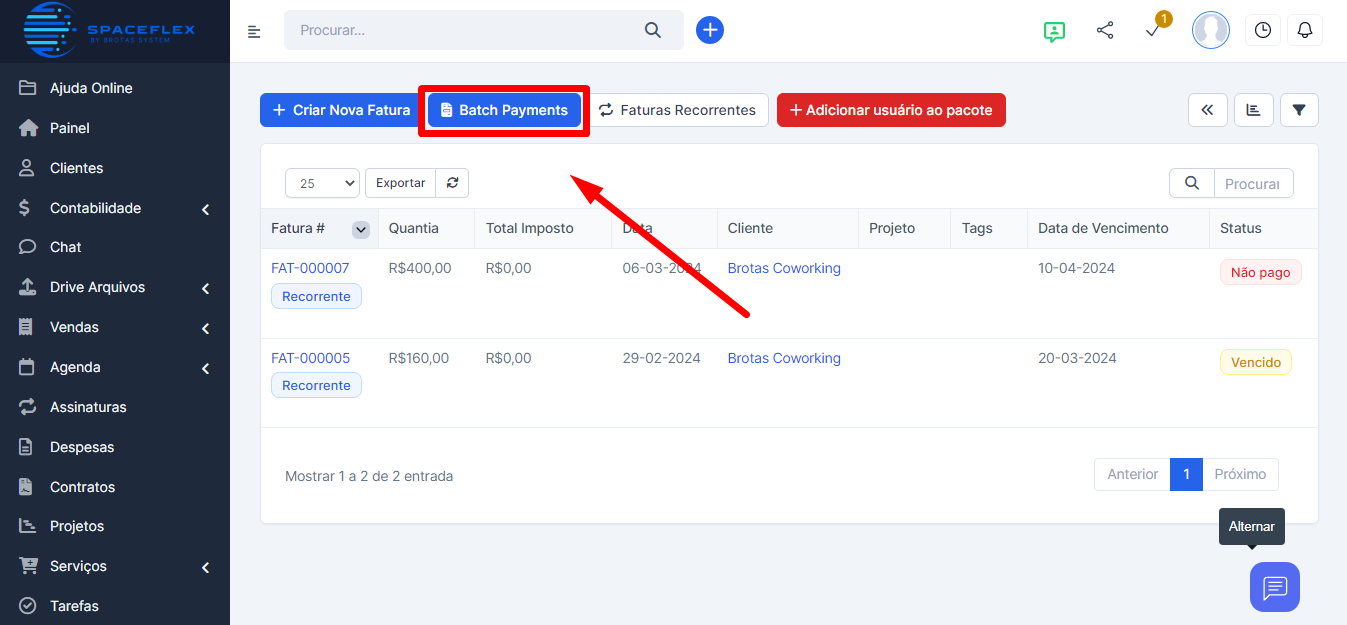 Para processar as faturas em lote acesse a página de Faturas da seção de Vendas.