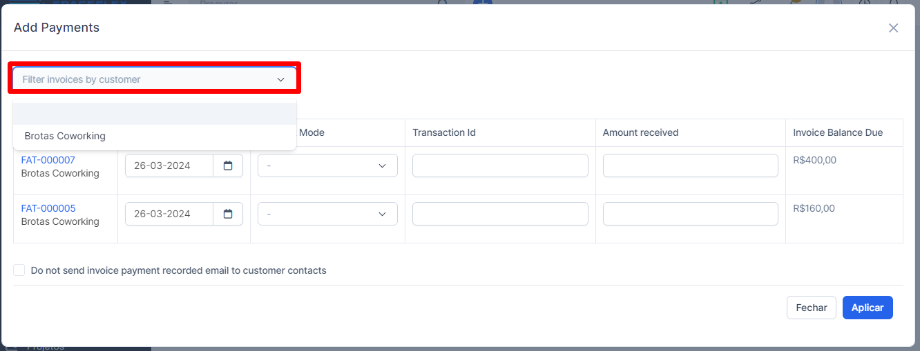 Será aberta uma janela com as faturas, onde pode ser registrado vários pagamentos de uma vez só. Filtre as faturas por cliente usando o campo destacado abaixo